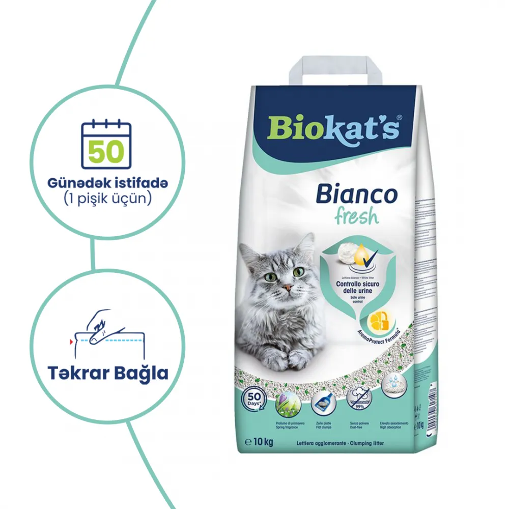 Biokat’s Bianco Fresh Topalanan pişik qumu. Orta boy qranullar dərhal mayeni hopdurur və yastı topalar yaradır. AromaProtect formulu xoşagəlməz qoxuları özündə qapayır. Pişik qumu bahar çiçəkləri və otları ətrinə malikdir. Təbii ağ gildən hazırlanıbdır və bunun sayəsində pişiyin sidik-ifrazat yolu xəstəliklərini vaxtında aşkarlamağa kömək edir. Demək olar ki, heç toz yaratmır. Qənaətli: 10 litrlik qablaşdırma bir pişik üçün (fizioloji xüsusiyyətlərindən asılı olaraq) 50 günədək bəs edir. Pişik qumunu açıb istifadə etdikdən sonra qablaşdırmanı təkrar bağlamaq olur və bu da çox rahatdır.