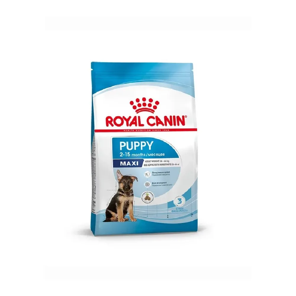 Royal Canin Maxi Puppy Böyük cins bala it üçün quru yem. 2 aydan 15 aya qədər böyük cins bala itlər üçün (yetkin itin çəkisi 26-44 kq) tam rasionlu quru yem. Böyümə mərhələsi bala itin immunitetinin formalaşmasında əsas dövrdür. Bu mərhələdə bala itinin immun sistemi tədricən inkişaf edir. Maxi Puppy yemi, vitamin E daxil olmaqla, antioksidantların patentli * kompleksi sayəsində bala itin orqanizminin təbii müdafiə mexanizmlərinin formalaşmasına imkan yaradır. Yüksək keyfiyyətli zülallar (LIP *) və prebiotiklər (fruktoliqosaxaridlər) tərkibli qidalandırıcı kompleks bağırsaq florasının balansını və nəcisin optimal konsistensiyasını qoruyaraq həzm sisteminə faydalı təsir göstərir. Orta kalori dərəcəsi böyümə müddətində böyük cins bala itlərin enerji ehtiyaclarını qarşılayır.